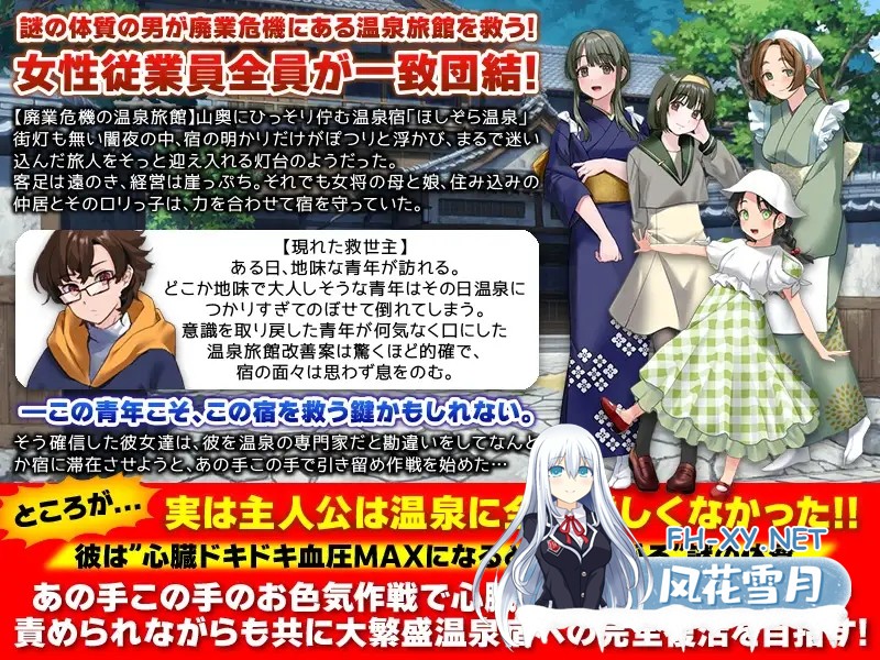 游戏简介 “心跳加速血压MAX时IQ就会上升”这一谜之体质的男人,拯救濒临倒闭的温泉旅馆! 女性员工全员团结 ...